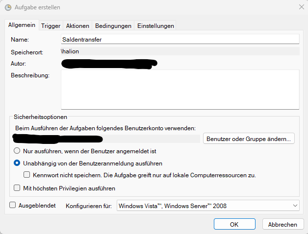 Hier kann nun der Name der Aufgabe angelegt werden und wichtig ist es "Unabhängig von der Benutzeranmeldung ausführen" auszuwählen: