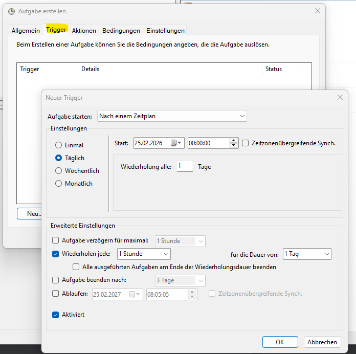 Als nächstes den Trigger definieren, wann die Aufgabe in welcher Wiederholung ausgeführt werden soll: