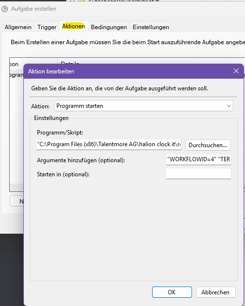 Zuletzt kann nun die Aktion definiert werden, wo die roconJobProcess.exe ausgewählt wird und als Argument die WORKFLOWID mitgegeben wird. Bei Terminalspezifischen Aktionen muss zusätzlich das Argument TERMINALCOUNT= angegeben werden: