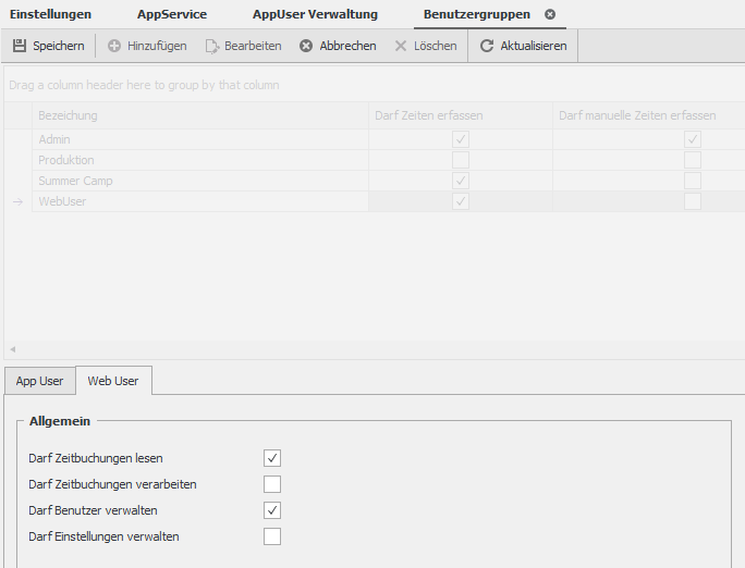 Weitere Benutzer neben dem Tenant Admin können über das Zusammenspiel von Benutzergruppen und dem Flagg "WebUser" in der AppUser Verwaltung freigeschaltet werden.