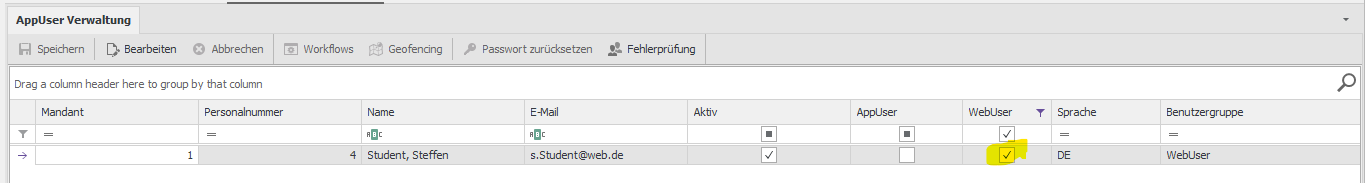 Anschließend können in der AppUser Verwaltung die passenden Gruppen zugeordnet und die WebUser freigeschaltet werden: